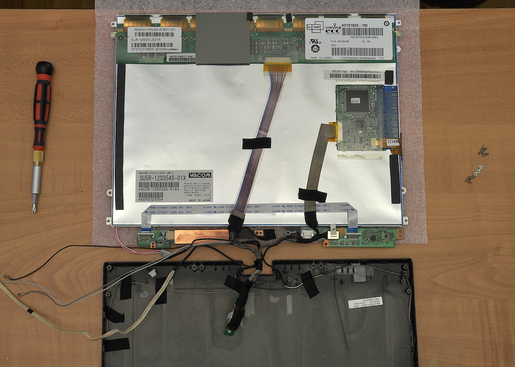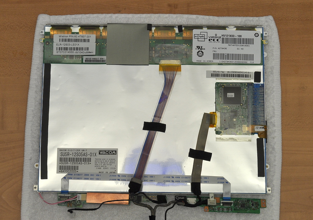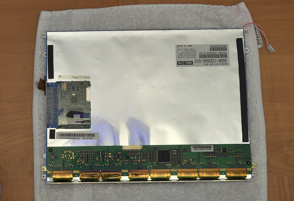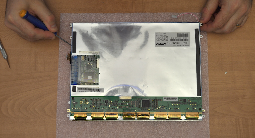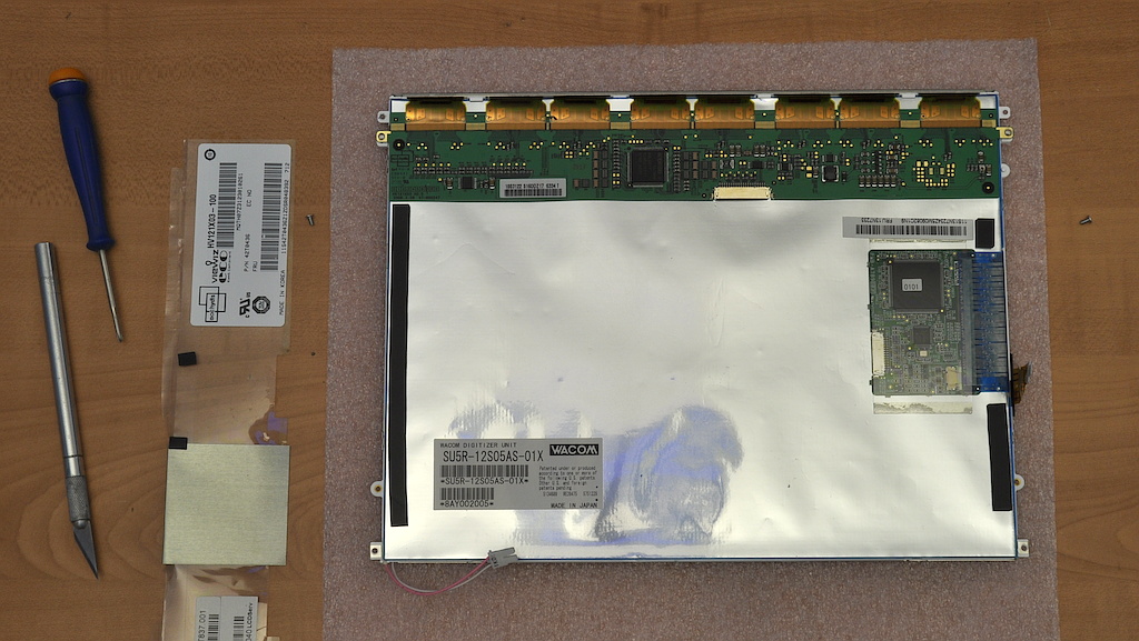 Anyway, onto peeling the panel apart... Remove the adhesive plastic/metal shield over the LCD driver, unscrew the driver board, disconnect the resistive touchscreen cable from the digitizer board.