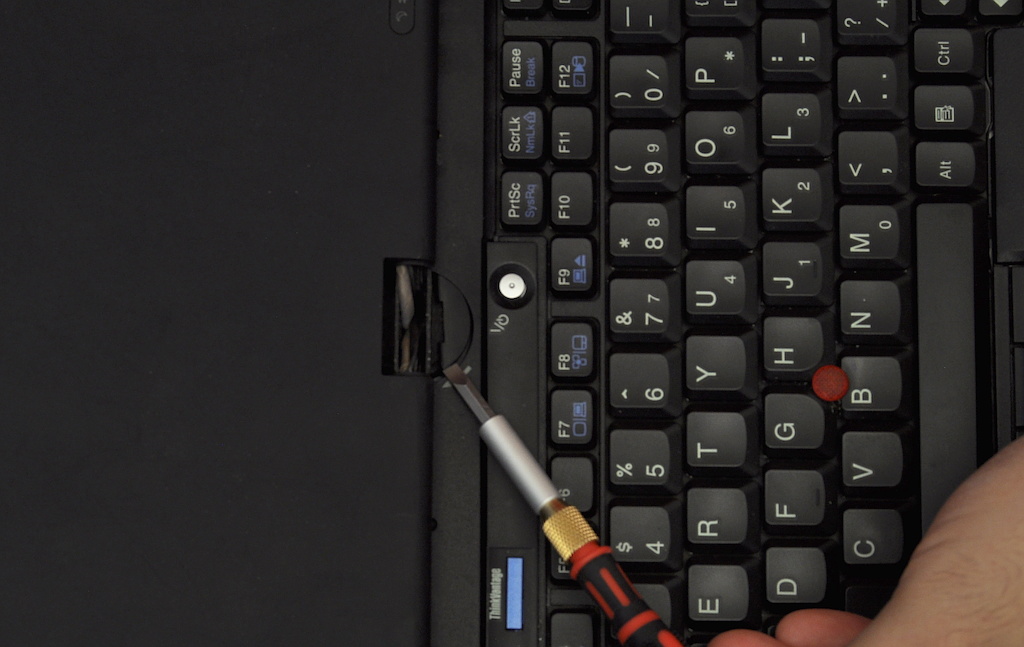 Attach a new hinge (the old one was still solid, but had picked up some play), reattach the fingerprint reader cable, snap the bezel back into place, replace the nine screws and return the cover discs, bumpers and square to their rightful places. The lid is done!