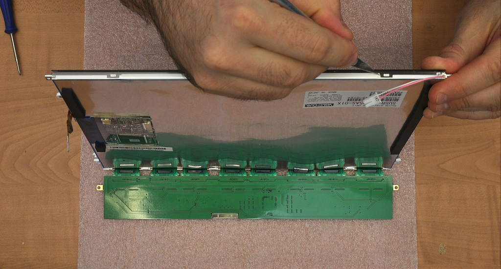 Untape the cables from the LCD and disconnect the two connectors. Set the cables and boards aside. We need to pull the LCD panel completely apart to get to the backlight.