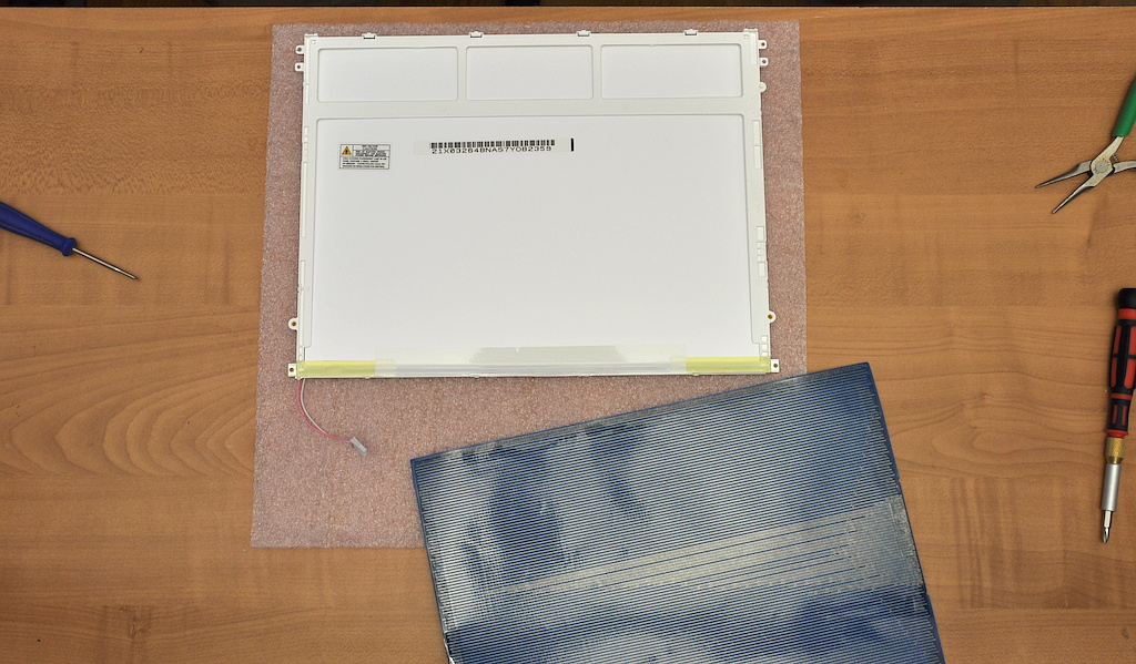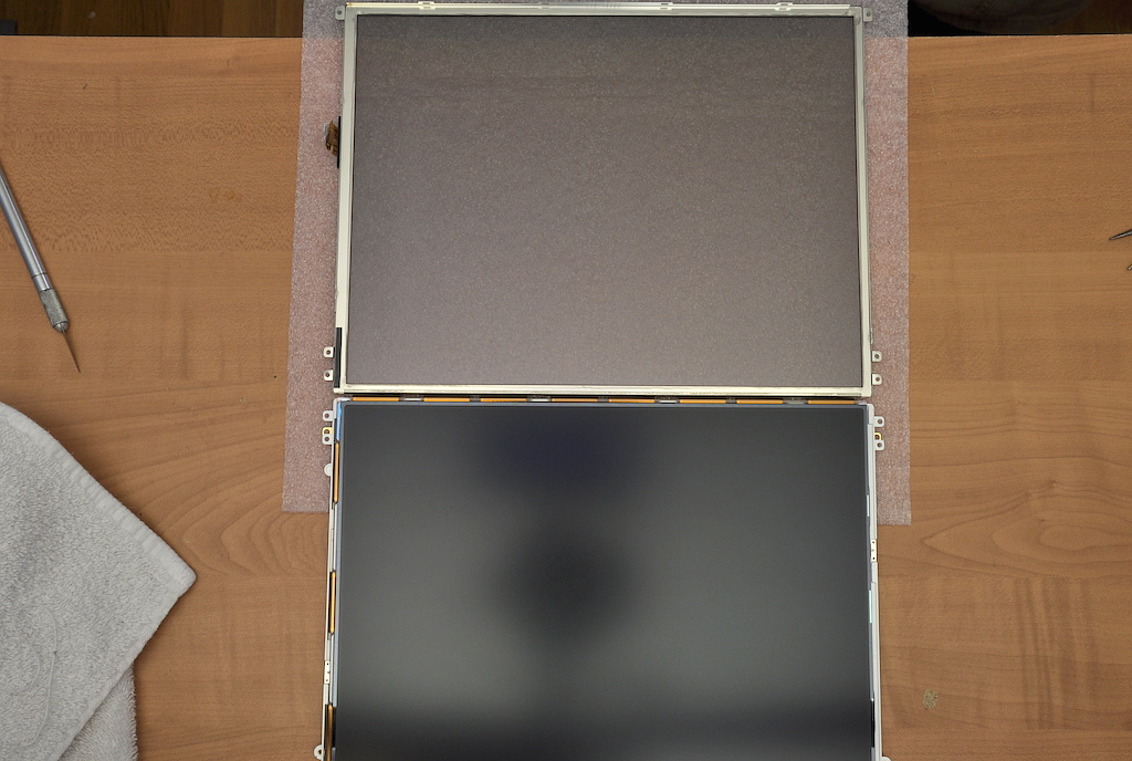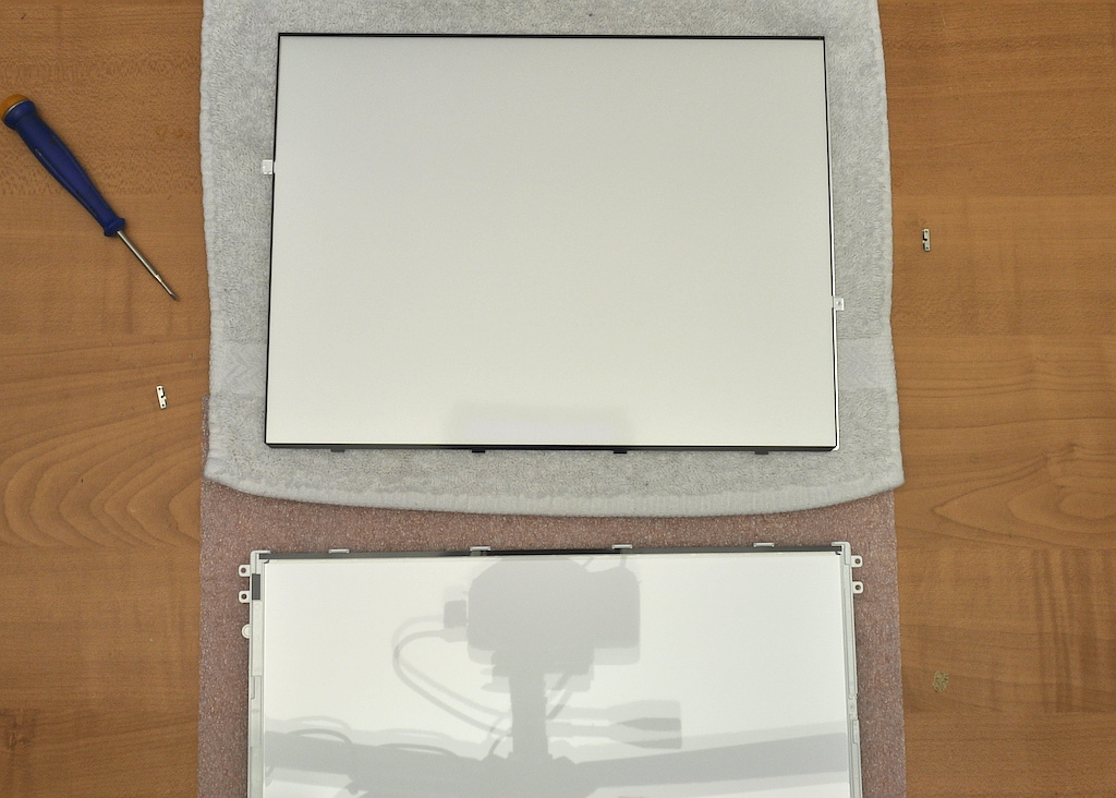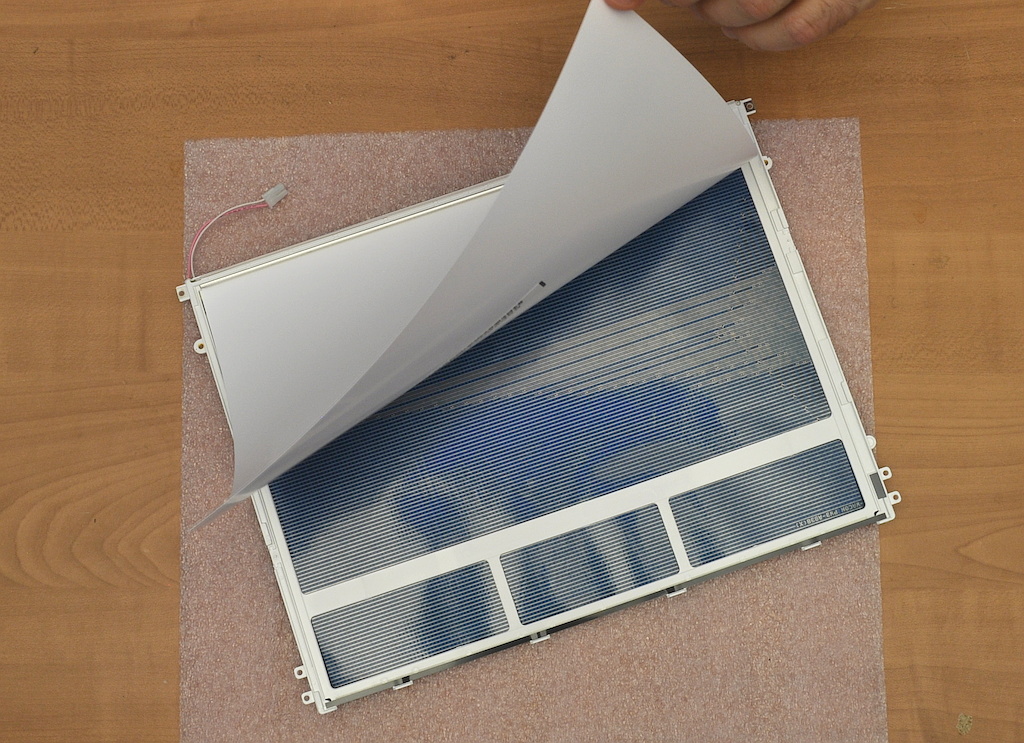 Flip the diffuser/polarizer layers all out together onto a soft, clean cloth. Cover and set aside.