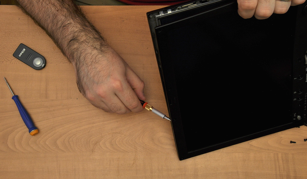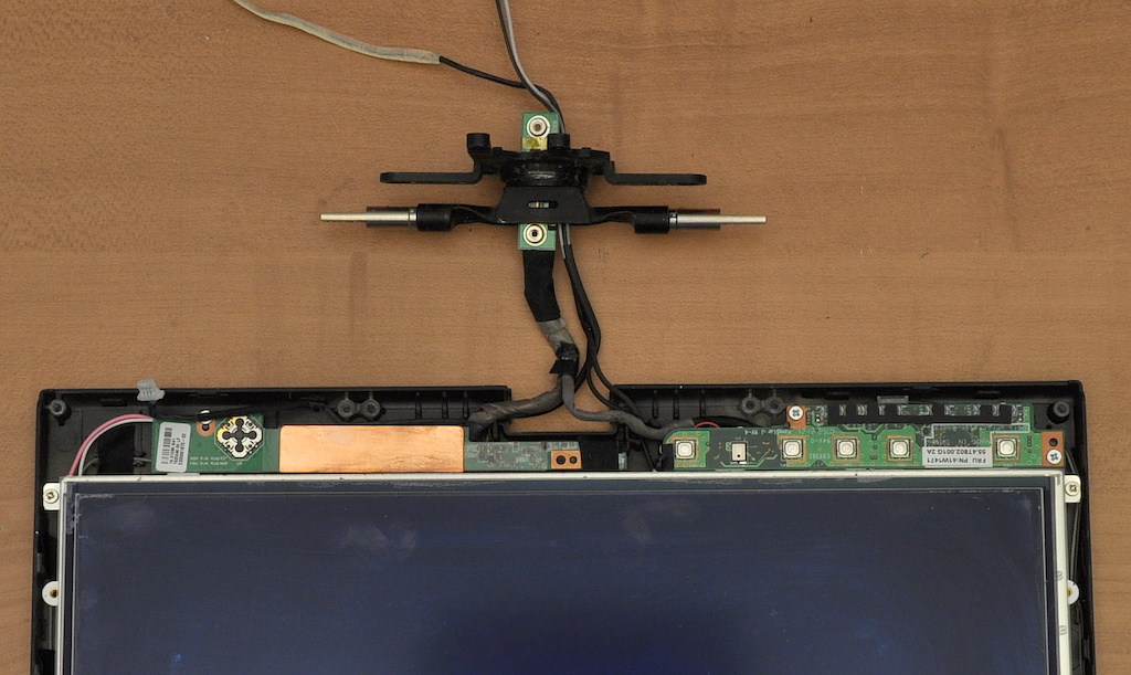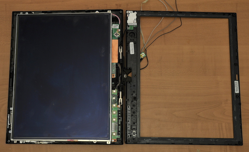 Remove the two screws holding in the button/LED board, the one screw holding in the backlight inverter, the ground cable screw behind the LED board, and the four screws holding in the LCD panel. Flip the panel, cables and two small boards out onto something soft.