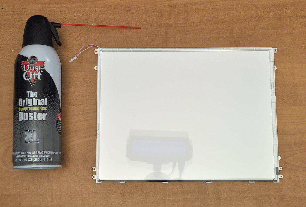 Place the panel back into the frame. Any dust between the diffuser layers and panel will be visible. Inspect for and flush any dust with canned air. Replace the metal frame by gently inserting the side of the white frame with the flat LCD flex cables, then dropping the metal frame down over the panel and snapping the lugs back together. When properly aligned, the snap-together process will go easily. If it seems like the metal frame just won't lower all the way into its lugs, don't force it! The LCD itself might not be seated properly and forcing will shatter it.